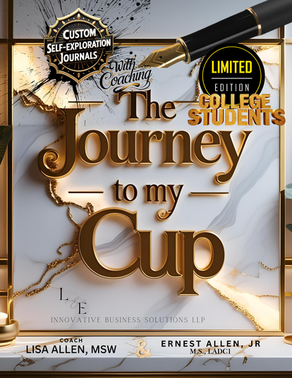 The College Edition of The Journey to My Cup Journal is designed to meet students at this critical stage of growth. Each begins with a 1-hour coaching assessment led by Lisa Allen, MSW, a therapist and consultant with years of experience helping individuals navigate transitions and build resilience. Lisa has successfully used these journals in her work to guide people through stress, separation, and life changes with clarity and confidence.